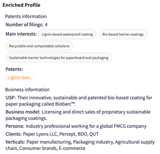An Enriched Company Profile gives you the full picture ( patents, business model, and key people) so you can quickly decide if it’s worth pursuing further. Here’s how to request yours: