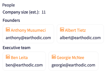 - People: Employee headcount, plus LinkedIn profiles and email addresses for founders, executives, and other key contacts.